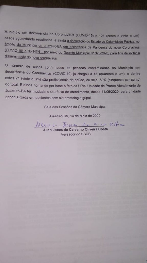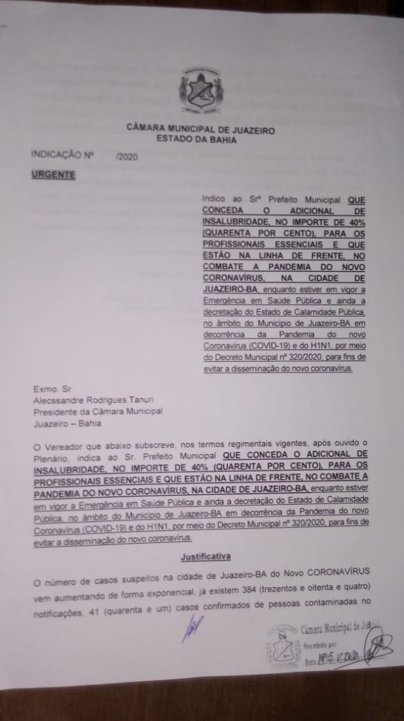 O Vereador Allan Jones (PSDB) teve a indicação que concede importe de 40%, para profissionais essenciais e que estão na linha de frente no combate a Pandemia do novo Coronavírus aprovada na Câmara de Juazeiro, durante a Sessão Ordinária virtual desta segunda-feira (18). O parlamentar agora espera que a Prefeitura seja sensível e conceda o benefício aos trabalhadores.