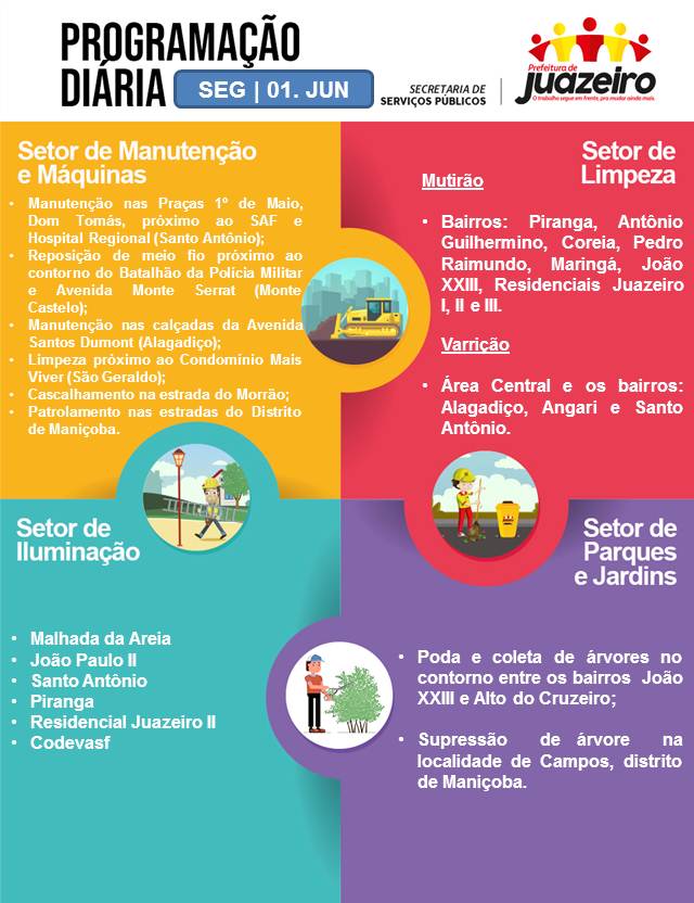 A Secretaria de Serviços Públicos (SESP) informa à população juazeirense a programação dos trabalhos relacionados à iluminação e limpeza dos espaços públicos para esta segunda-feira (01).