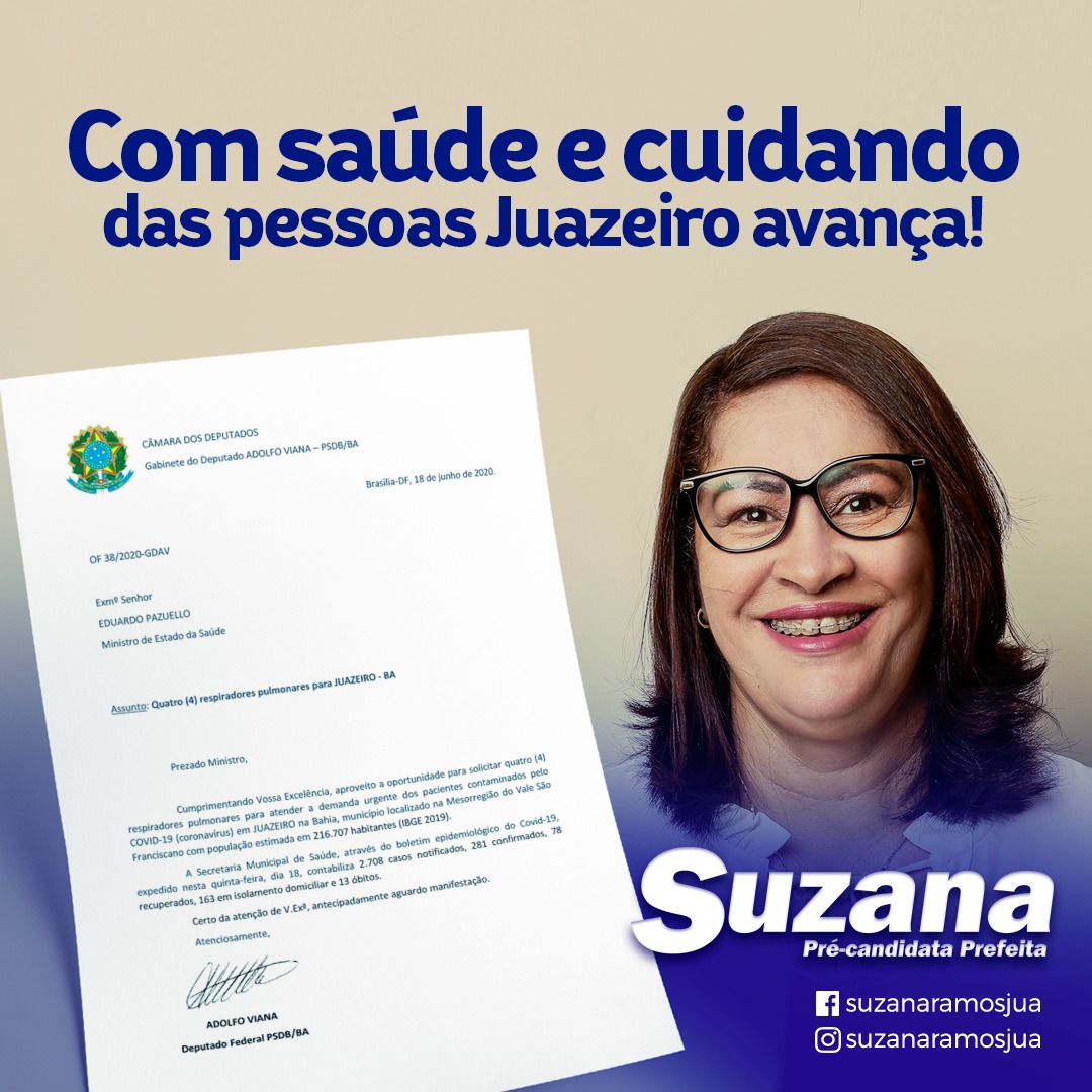 Os pré-candidatos a Prefeitura de Juazeiro, Suzana Ramos e Allan Jones, agradeceram ao Deputado Federal Adolfo Viana pela viabilização de 04 (quatro) respiradores pulmonares para a cidade, através do Governo Federal.