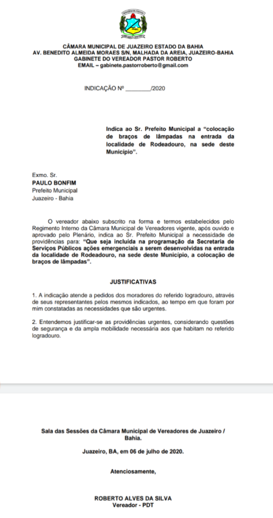 O vereador Pastor Roberto (PDT) solicitou a Ju Prefeitura de Juazeiro a realização de serviços de iluminação, através da Secretária de
