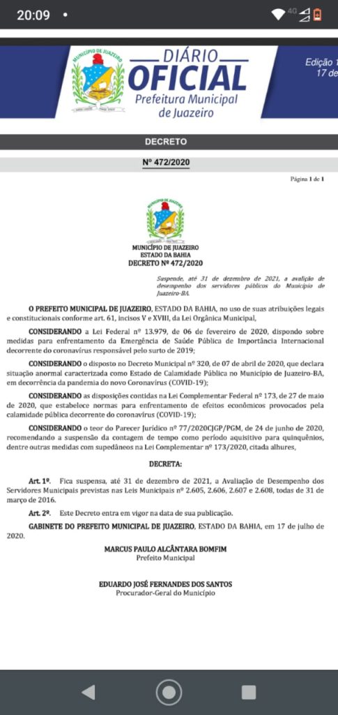 O vereador Allan Jones (PSDB) vai requerer junto à Câmara Municipal e demais instituições responsáveis a ANULAÇÃO do Decreto Municipal N° 472/2020, que suspende até 31 de dezembro de 2021 a Avaliação de Desempenho dos Servidores Públicos Municipais de Juazeiro-BA. A atuação do parlamentar endossa os protestos divulgados pelos professores, servidores da saúde e demais categorias funcionais.