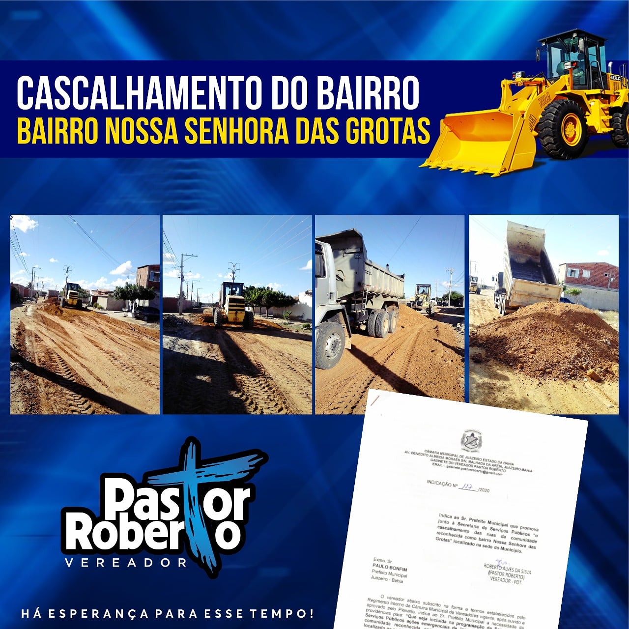 O Pastor Roberto (PDT) indicou e a Prefeitura de Juazeiro atendeu. Dessa vez as vias do bairro Senhora das Grotas receberam serviço de cascalhamento. “Em contato com os moradores, eles me falaram dessa necessidade e em pouco tempo a comunidade foi beneficiada”, disse o parlamentar.