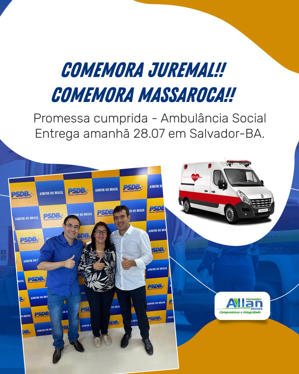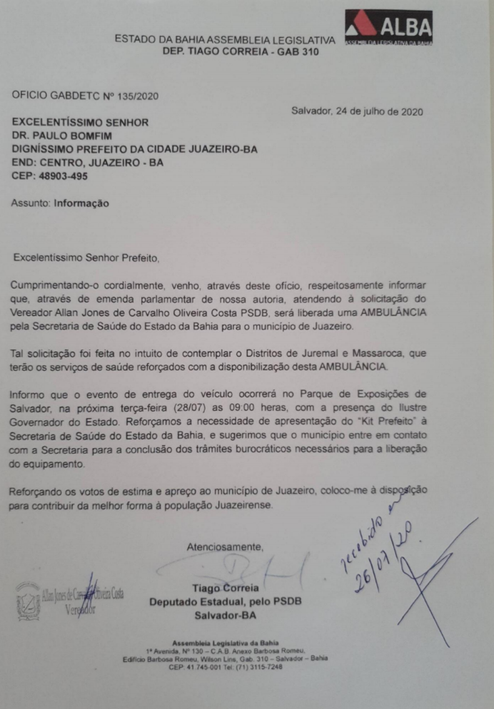 O vereador Allan Jones (PSDB) teve sua solicitação de uma Ambulância Social para as comunidades de Massaroca e Juremal atendida pelo deputado estadual Tiago Correia (PSDB). O veículo foi viabilizado através de emenda parlamentar.