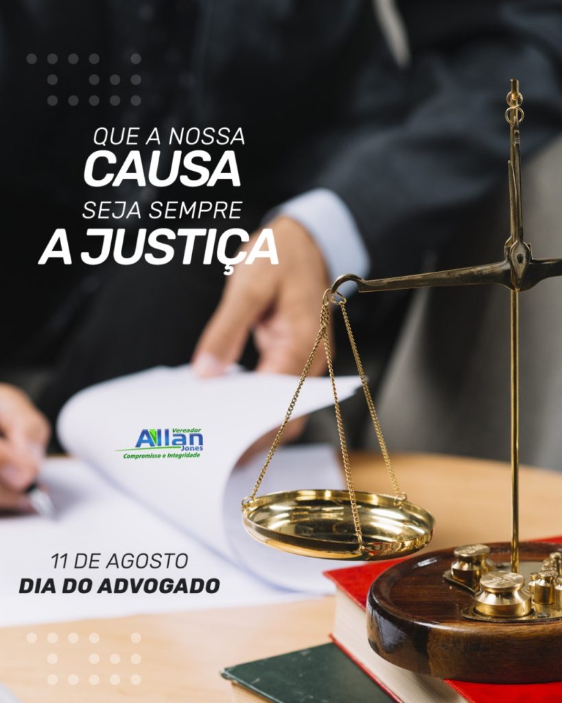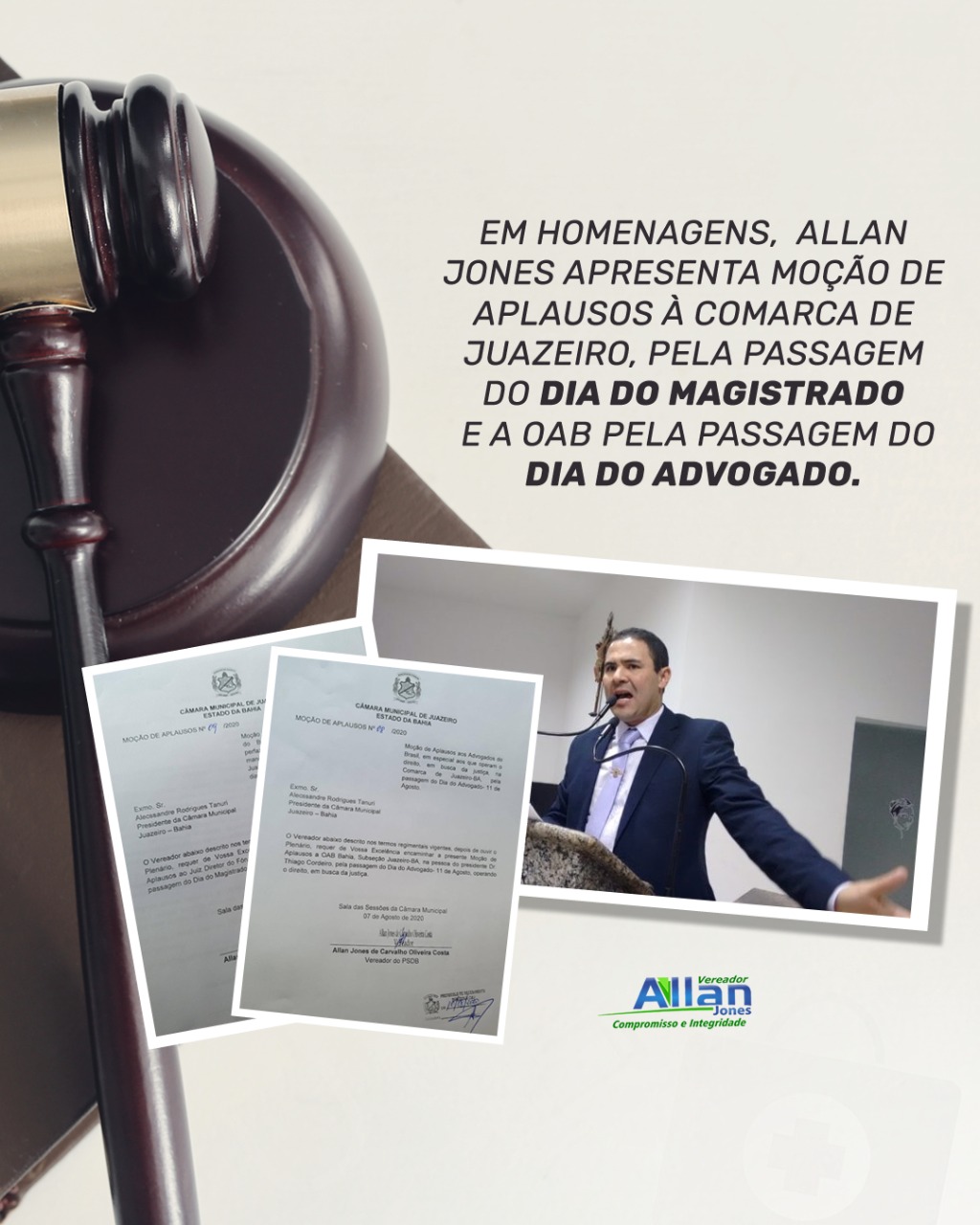 O Vereador Allan Jones (PSDB), que também é médico e advogado, encaminhou Moção de Aplausos ao Juiz Diretor do Fórum Conselheiro Luiz Viana, em Juazeiro-BA, pela passagem do Dia do Magistrado e à Ordem dos Advogados do Brasil (OAB) na Bahia, Subseção Juazeiro, pela passagem do Dia do Advogado, ambos comemorados no dia 11 de Agosto.