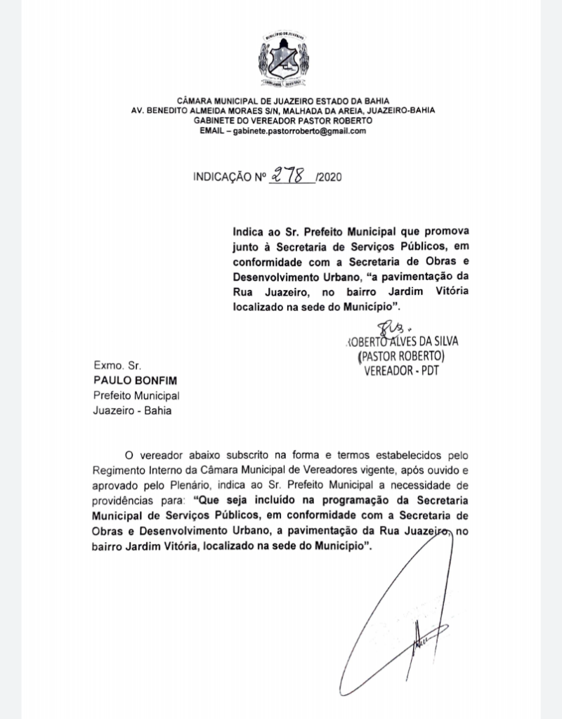 O vereador Pastor Roberto (PDT) solicitou através de indicação à Prefeitura Municipal a necessidade de providências para “Que seja incluído na programação da Secretaria Municipal de Serviços Públicos, em conformidade com a Secretaria de Obras e Desenvolvimento Urbano, a pavimentação da Rua Juazeiro bairro Jardim Vitória, em Juazeiro.