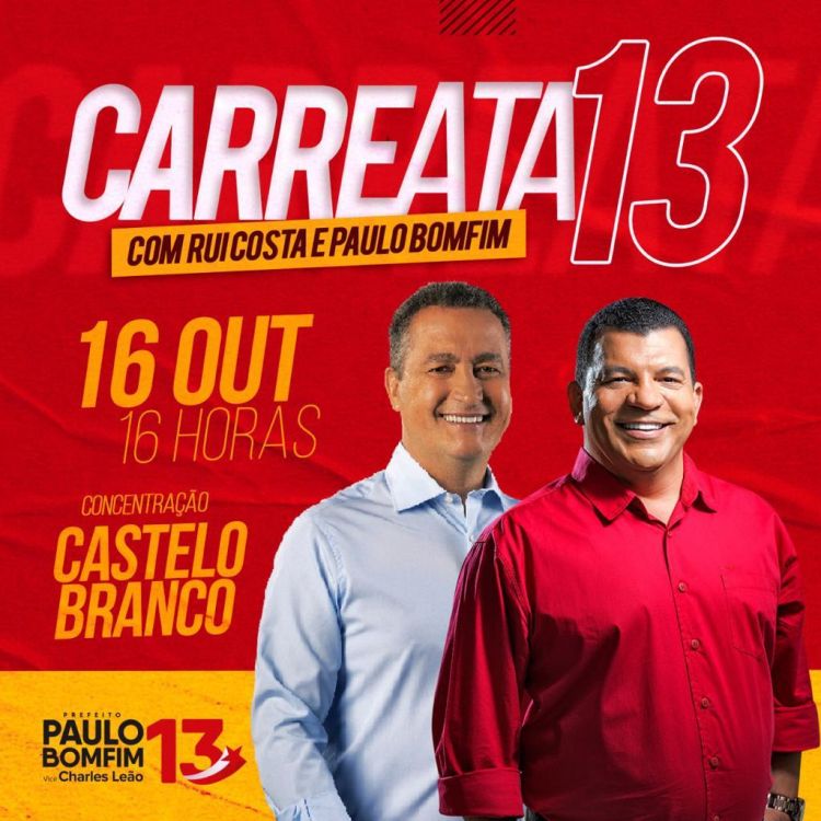 Nesta sexta-feira (16), o Governador Rui Costa estará ao lado do prefeito e candidato à reeleição pela coligação “Pra Juazeiro Seguir em Frente”, Paulo Bomfim, e o vice Charles Leão, em mais uma grande Carreata do 13! A concentração será às 16h no bairro Castelo Branco, em seguida, percorrerá diversos bairros da cidade.