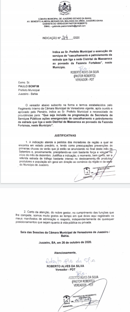 O vereador Pastor Roberto (PDT) protocolou Indicação nesta segunda-feira (26), na Câmara de Juazeiro solicitando para seja incluida na programação da Secretaria de Serviços Públicos ações emergenciais de cascalhamento e patrolamento da estrada que liga a sede Distrital de Massaroca ao povoado da Fazenda Fortaleza, neste Municipio.