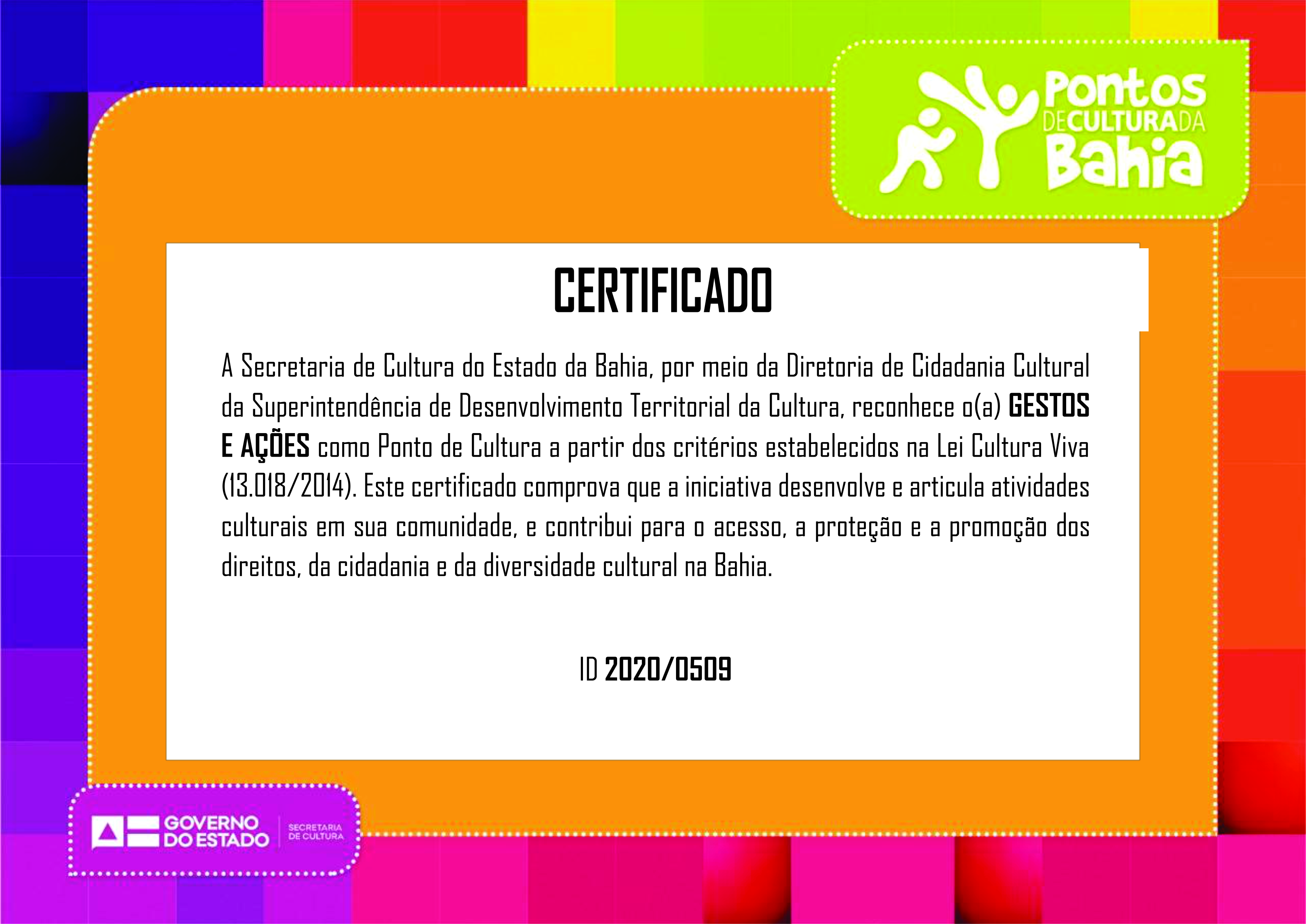 A Secretaria de Cultura do Estado da Bahia, por meio da Diretoria de Cidadania Cultural da Superintendência de Desenvolvimento Territorial da Cultura, concede o certificado de Ponto de Cultura para o grupo cultural Gestos e Ações, um dos mais tradicionais no âmbito da cultura da cidade de Sobradinho.