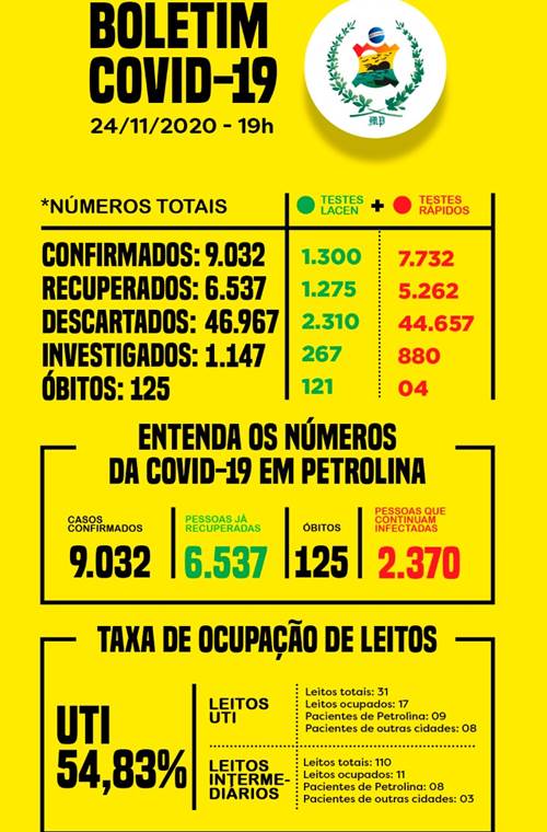 A taxa de ocupação geral dos leitos de UTI da rede pública é de 54,83% nesta terça. Dos 31 leitos disponíveis, 17 estão ocupados, sendo 9 por pacientes de Petrolina e 8 por aqueles de outras cidades da região. Os dados completos podem ser acessados pelo link.