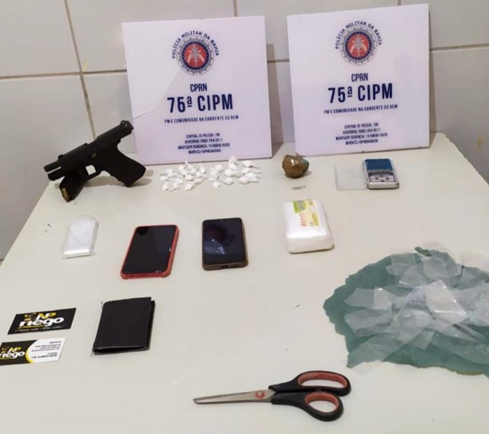 O policial conseguiu tomar a arma do agressor, uma pistola marca Glock, modelo G-25, oxidada, cal. 380, com 01 carregador e 02 munições e conter o homem. Com ele, ainda segundo a PM foi “”encontrado um saco plástico transparente contendo 10 petecas de cocaína”.