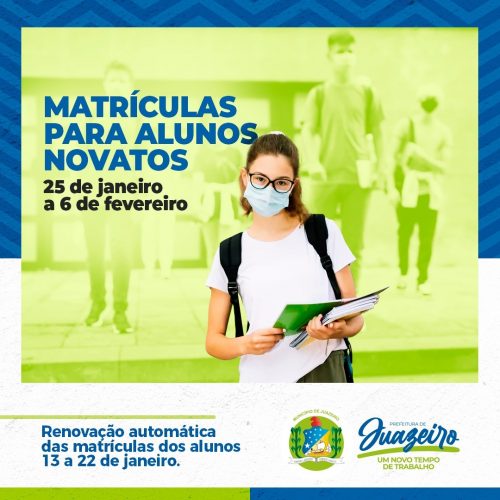 A Prefeitura de Juazeiro já definiu o período de matrículas para o ano letivo 2021 dos novos alunos da rede municipal de ensino. Acontecerá de 25 de janeiro a 6 de fevereiro, através de um link que será disponibilizado no site da Prefeitura de Juazeiro no período indicado.
