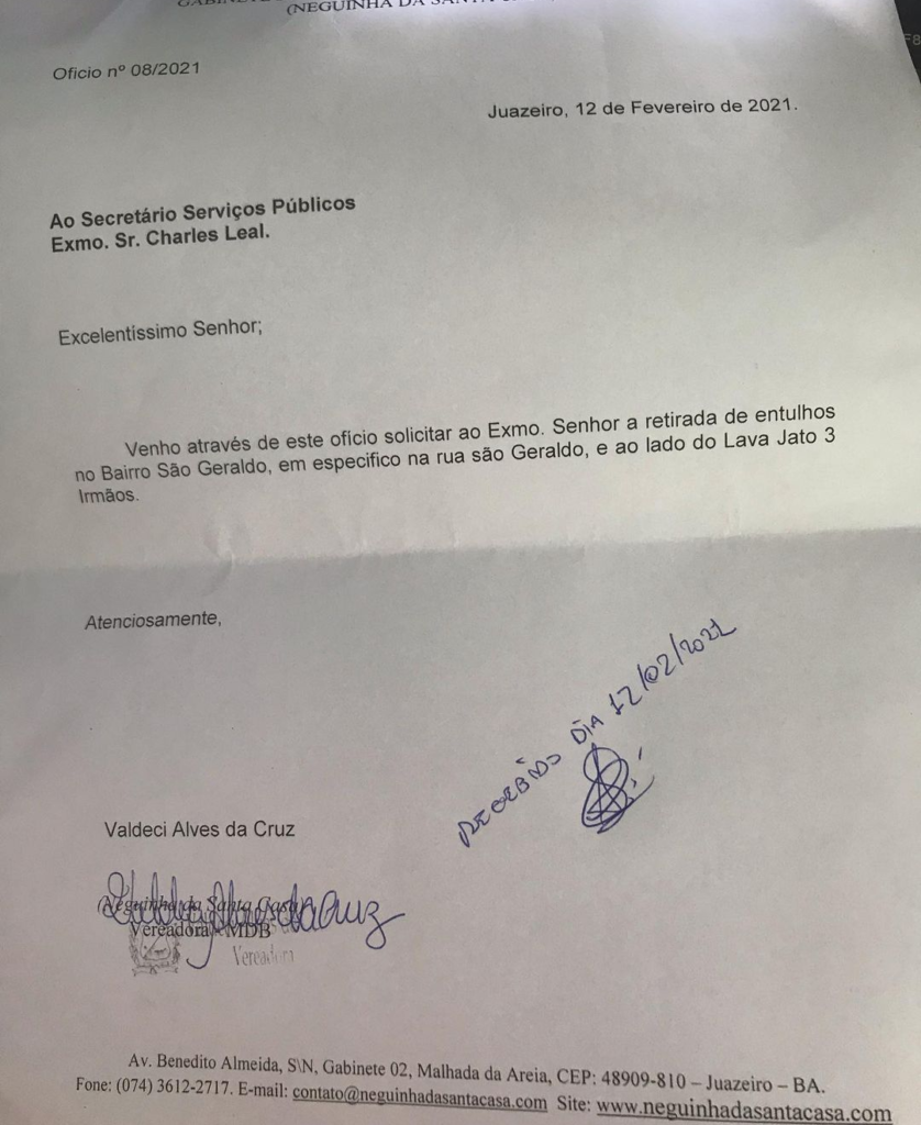 A vereadora Neguinha da Santa Casa (MDB) solicitou ao secretário de Serviços Públicos de Juazeiro, Charles Leal, o serviço de reposição de lâmpadas no Projeto Mandacaru I e retirada de entulhos no bairro São Geraldo.