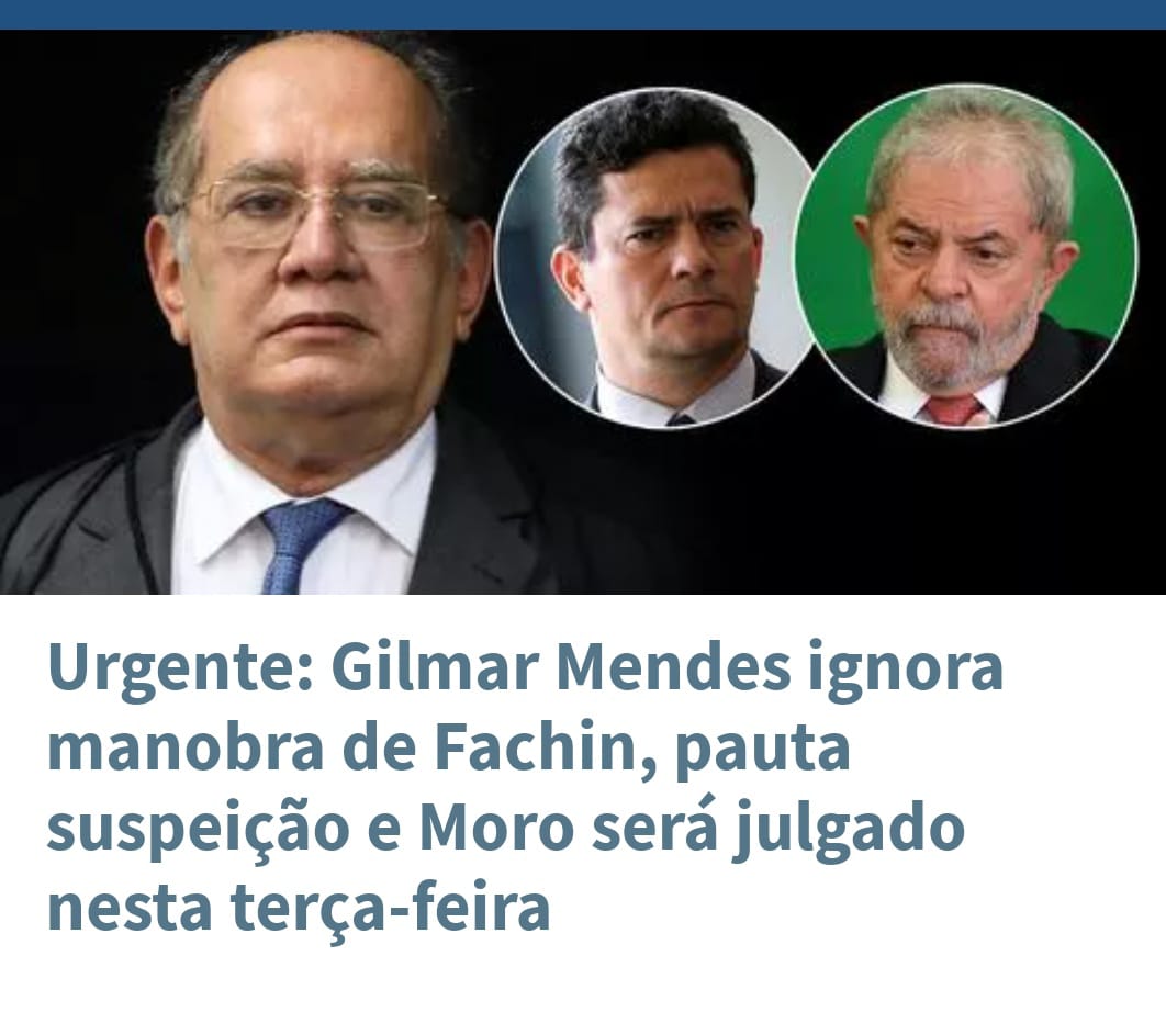 – O ministro Gilmar Mendes, do Supremo Tribunal Federal, decidiu ignorar a manobra de seu colega Edson Fachin, que anulou as condenações do ex-presidente Luiz Inácio Lula da Silva para tornar sem efeito a suspeição do ex-juiz Sérgio Moro. Gilmar decidiu pautar para hoje o julgamento da suspeição, o que abre espaço para que Moro, que perseguiu Lula para eleger Jair Bolsonaro, de quem foi ministro, seja declarado suspeito. A informação foi confirmada em primeira mão pela jornalista Mônica Bergamo.