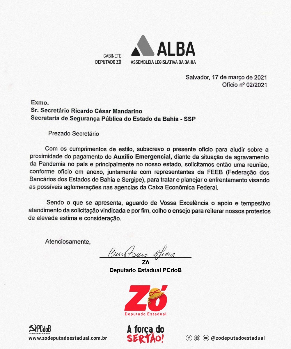 Nesta quinta-feira, 18, o deputado estadual Zó enviou ofício às secretarias da Saúde e da Segurança Pública do estado para que fiquem atentas ao período de recebimento do auxílio emergencial e assim planejem me conjunto ações que possam evitar aglomerações nas agências bancárias da Caixa Econômica na Bahia, e assim diminuir o contágio da Covid-19, neste momento delicado da pandemia.