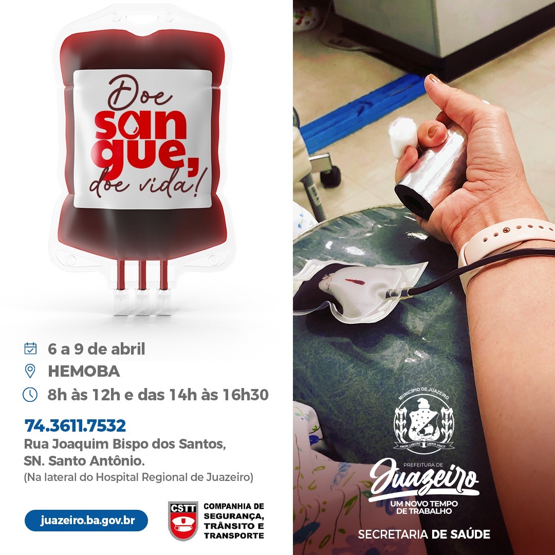 Começa nesta terça-feira (6) e segue até o dia 9 de abril, a campanha ‘Doe sangue, doe vida’, promovida pela Prefeitura de Juazeiro, através da Companhia de Segurança, Trânsito e Transporte (CSTT), com o apoio da Secretaria Municipal de Saúde (Sesau).