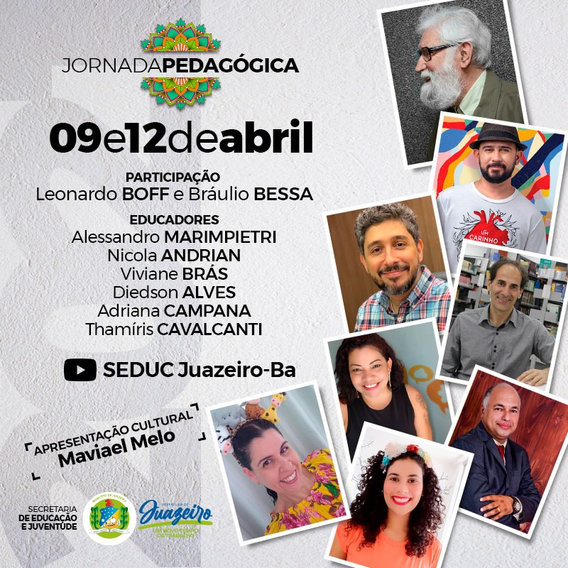 A Prefeitura de Juazeiro irá promover nos dias 9 e 12 de abril, a Jornada Pedagógica 2021. O evento é organizado pela Secretaria de Educação e Juventude (Seduc), e este ano, devido à pandemia da Covid-19, será realizado de forma virtual, através do canal Seduc Juazeiro- Ba, no Youtube. Houve uma alteração na programação e agora integra o quadro de palestrantes, o filósofo Leonardo Boff, em substituição ao também filósofo Mário Sergio Cortella.