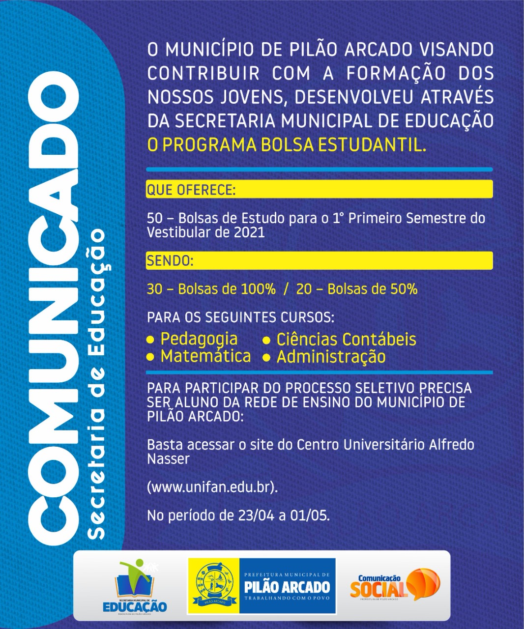 Todo o processo de seleção, que se inicia no dia 23 de abril de 2021 e vai até o dia 01 de Maio de 2021, será realizado pelo Centro Universitário Alfredo Nasser, acessado nesse endereço eletrônico: www.unifan.edu.br e a única exigência é a comprovação do jovem ser aluno da rede municipal de ensino do município de Pilão Arcado.