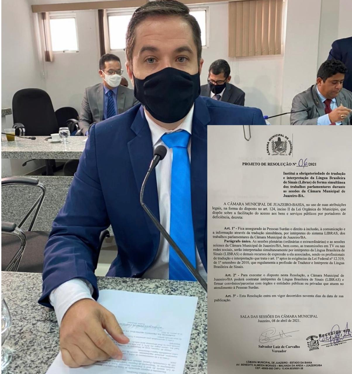 Nesta terça-feira, 27 de abril de 2021, o Vereador, Salvador Carvalho apresentou o Projeto que fica assegurado às pessoas surdas o direito à inclusão, a comunicação e a informação através da tradução simultânea, por intérpretes do sistema Língua Brasileira de Sinais (LIBRAS), nos trabalhos dos parlamentares nas sessões da Câmara Municipal de Juazeiro – Ba.
