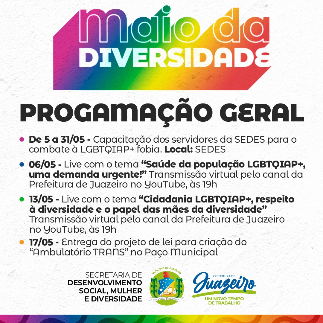 O mês de maio é marcado pela luta dos direitos da população LGBTQIAP+. Para celebrar a data, a Prefeitura de Juazeiro, através da Secretaria de Desenvolvimento Social, Mulher e Diversidade (SEDES), preparou uma programação especial para discutir os temas relacionados à causa em lives, capacitações e exposição de artes visuais, a partir desta quarta-feira (05).