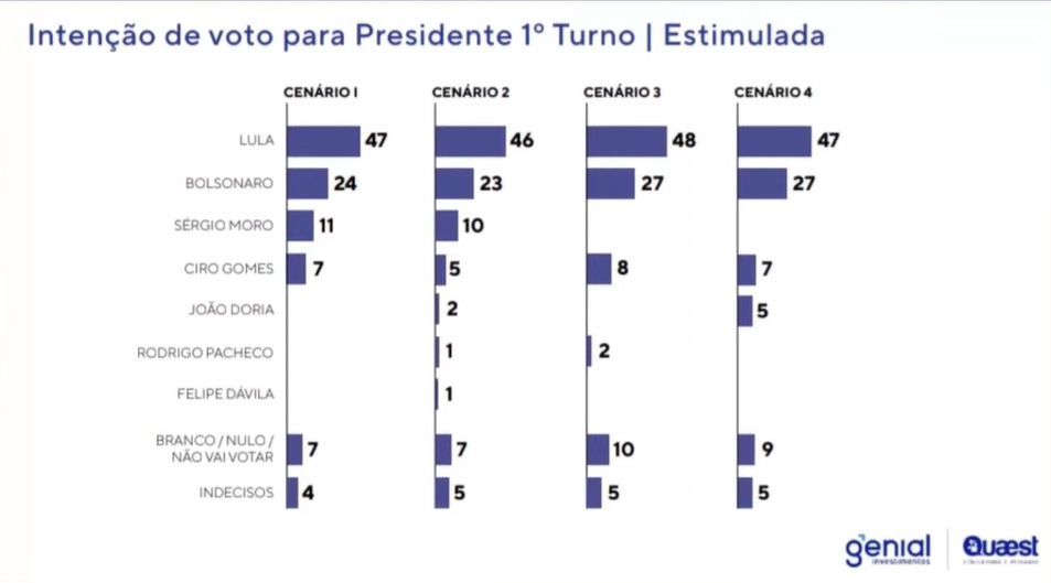 No cenário com sete pré-candidatos, Lula teria 46% dos votos; Bolsonaro, 23%; Sergio Moro viria em terceiro, com 10%; Ciro Gomes, na quarta posição, com 5%; João Doria (PSDB), com 2%; e Rodrigo Pacheco (PSD) e Felipe D’Ávila empatados com 1%. O número de brancos e nulos é de 7% e o de indecisos, 5%.