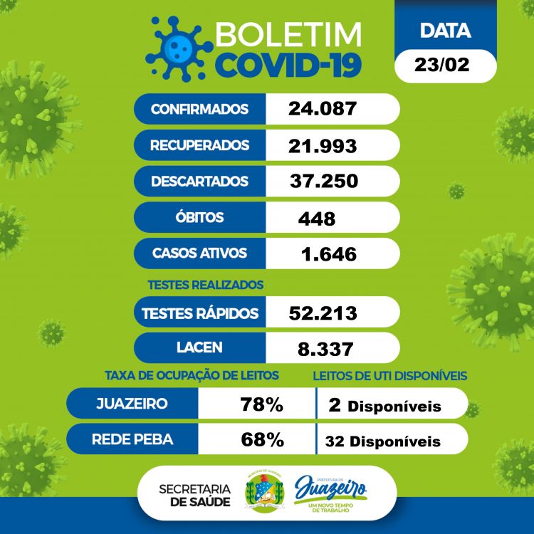 Na rede hospitalar, o percentual de ocupação dos leitos de UTI para Juazeiro na rede PEBA (hospitais de Pernambuco e Bahia) é de 68%, com 32 leitos disponíveis. Em Juazeiro, 78% dos leitos de UTI para pacientes com Covid-19 estão ocupados, com 2 leitos disponíveis.Ascom SESAU/PMJ
