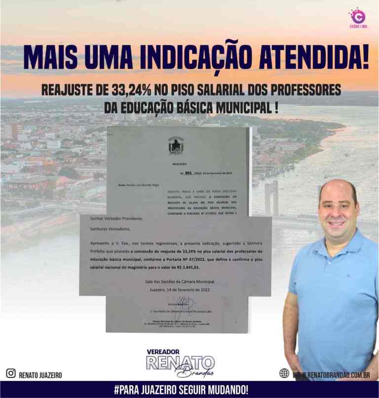 Feliz pela indicação ter sido atendida, Renato Brandão falou sobre a importância da valorização dos profissionais de educação. “Fiquei muito feliz em saber que a gestão municipal, vai realizar o reajuste para os profissionais de educação. Nós realizamos a indicação, sabendo da grande necessidade de valorizar os professores e dar boas condições de trabalho, para que as nossas crianças e adolescentes recebam uma educação de boa qualidade, e sabemos também que uma cidade bem educada, se desenvolve com facilidade, sendo assim eu reforço meu compromisso em levar melhorias na qualidade de vida de toda a população de Juazeiro”.