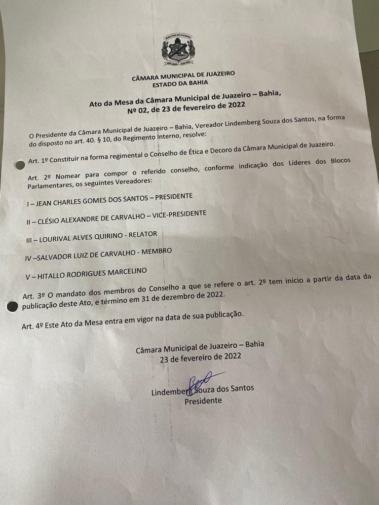 Pela primeira vez na história de Juazeiro, um presidente da Câmara Municipal institui um Conselho de Ética na Casa Aprígio Duarte.